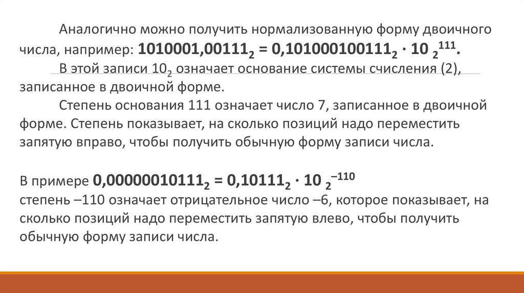 Аналогично можно получить нормализованную форму двоичногочисла, например: 1010001,001112 = 0,1010001001112 ∙ 10 2111.