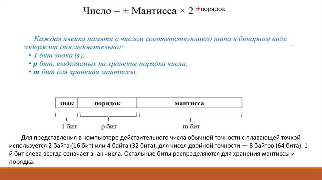 Для представления в компьютере действительного числа обычной точности с плавающей точкойиспользуется 2 байта (16 бит) или 4 байта (32 бита), для чисел двойной точности — 8 байтов (64 бита). 1й бит слева всегда означает знак числа. Остальные биты распределяются для хранения мантиссы и