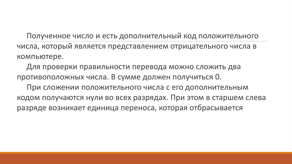 Полученное число и есть дополнительный код положительногочисла, который является представлением отрицательного числа в