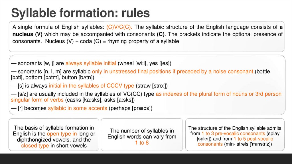 Syllable formation: rulesA single formula of English syllables: (C)V/C(C). The syllabic structure of the English language consists of a
