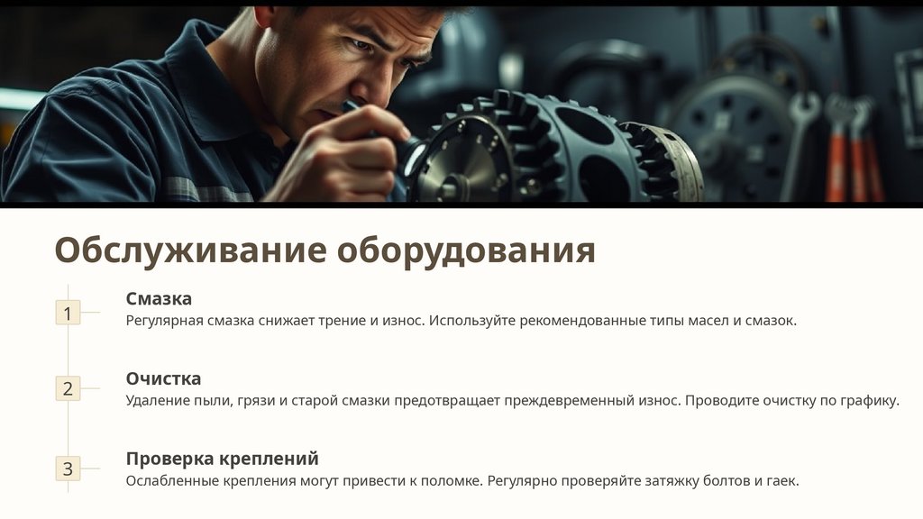 Регулярная смазка снижает трение и износ. Используйте рекомендованные типы масел и смазок.