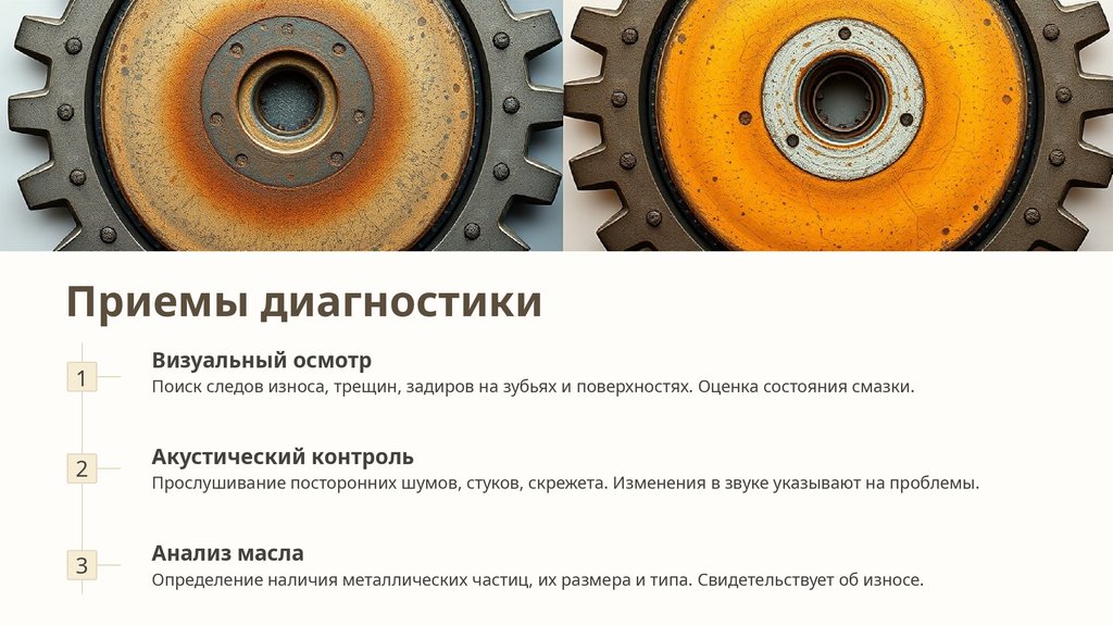 Поиск следов износа, трещин, задиров на зубьях и поверхностях. Оценка состояния смазки.