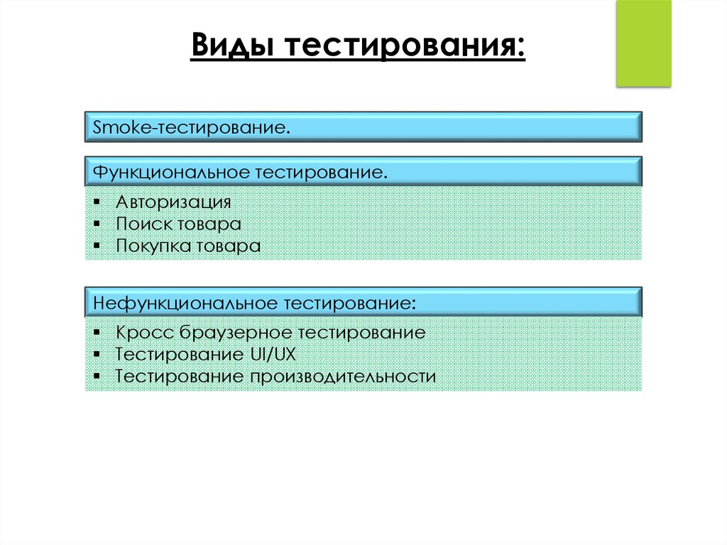 Виды тестирования:Smoke-тестирование.