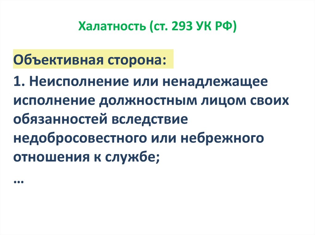 Халатность (ст. 293 УК РФ)Объективная сторона: