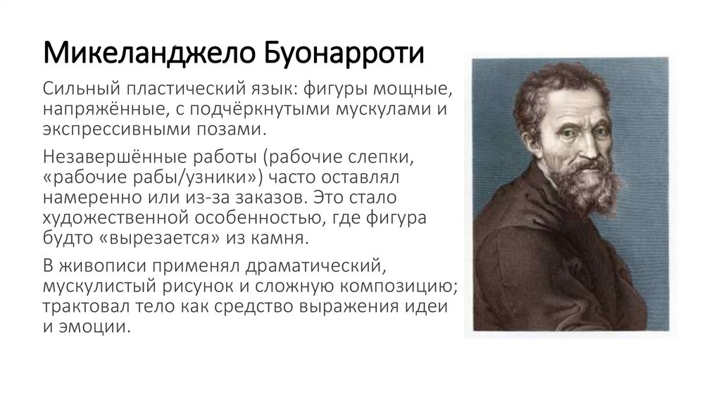 Микеланджело БуонарротиСильный пластический язык: фигуры мощные,