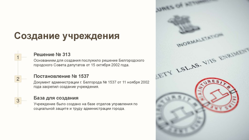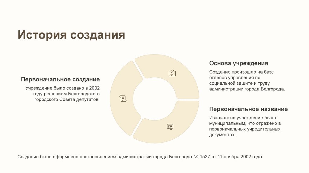 Создание было оформлено постановлением администрации города Белгорода № 1537 от 11 ноября 2002 года.