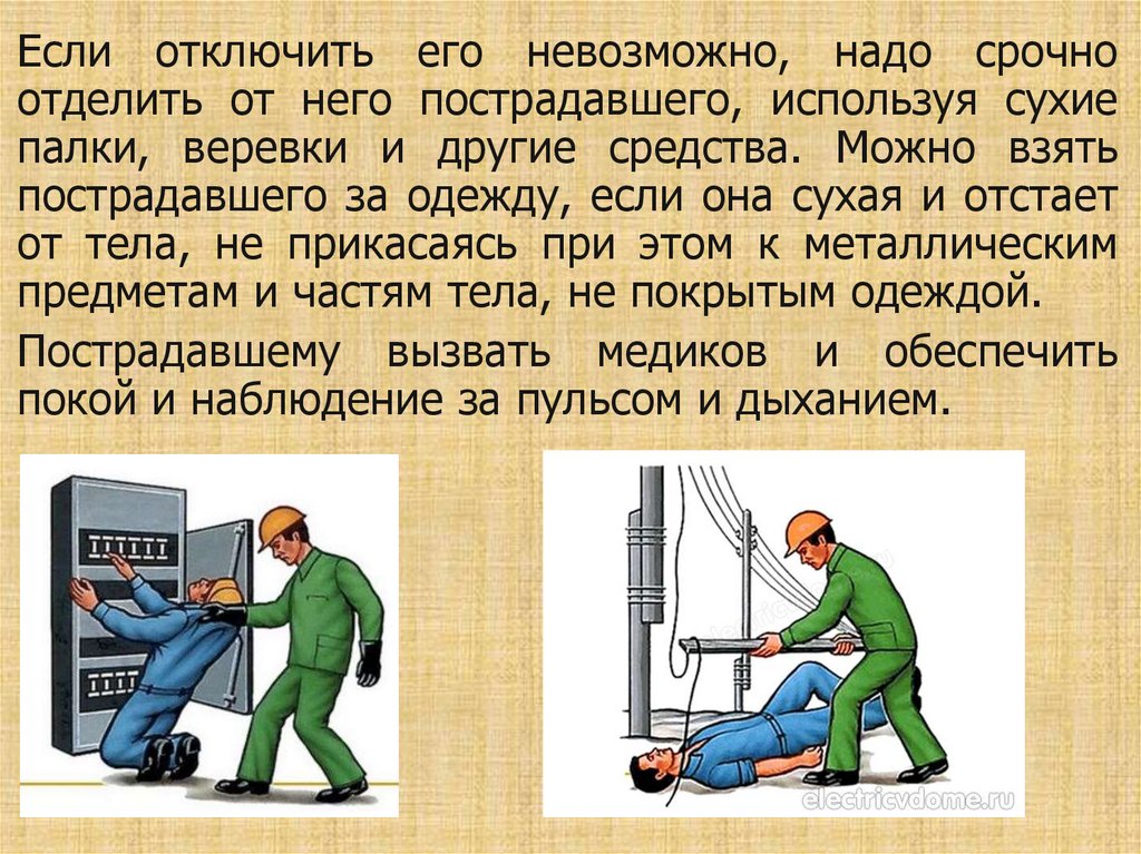 Если отключить его невозможно, надо срочноотделить от него пострадавшего, используя сухие