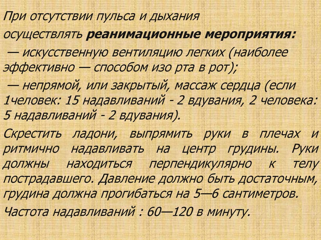 При отсутствии пульса и дыханияосуществлять реанимационные мероприятия: