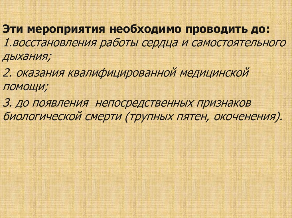 Эти мероприятия необходимо проводить до:1.восстановления работы сердца и самостоятельного