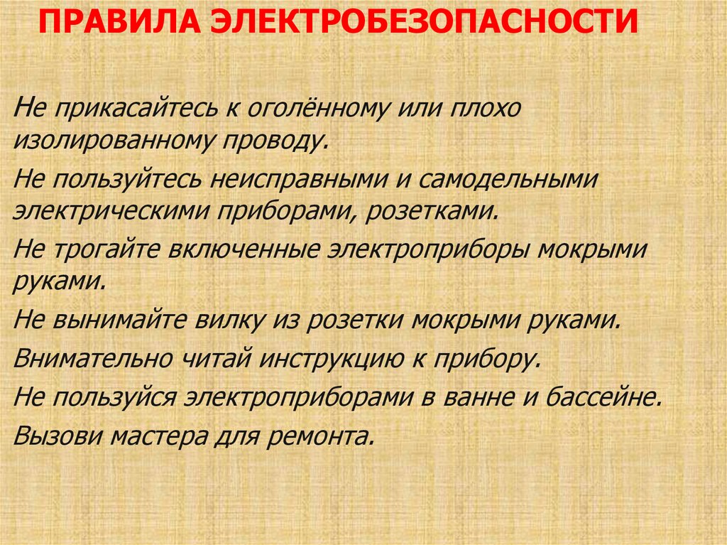 ПРАВИЛА ЭЛЕКТРОБЕЗОПАСНОСТИНе прикасайтесь к оголённому или плохо