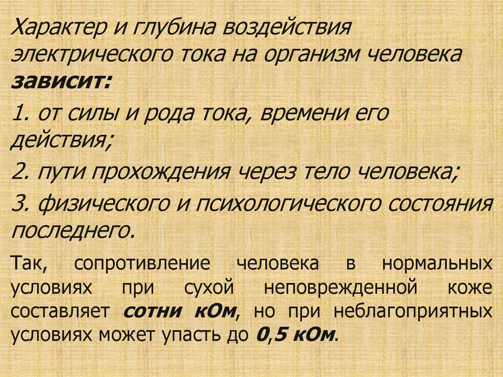 Характер и глубина воздействияэлектрического тока на организм человека