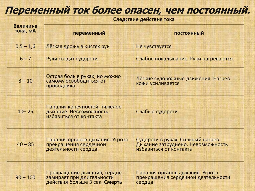 Переменный ток более опасен, чем постоянный.Следствие действия тока