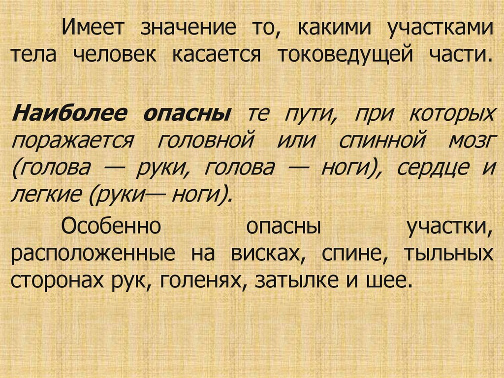 Имеет значение то, какими участкамитела человек касается токоведущей части.