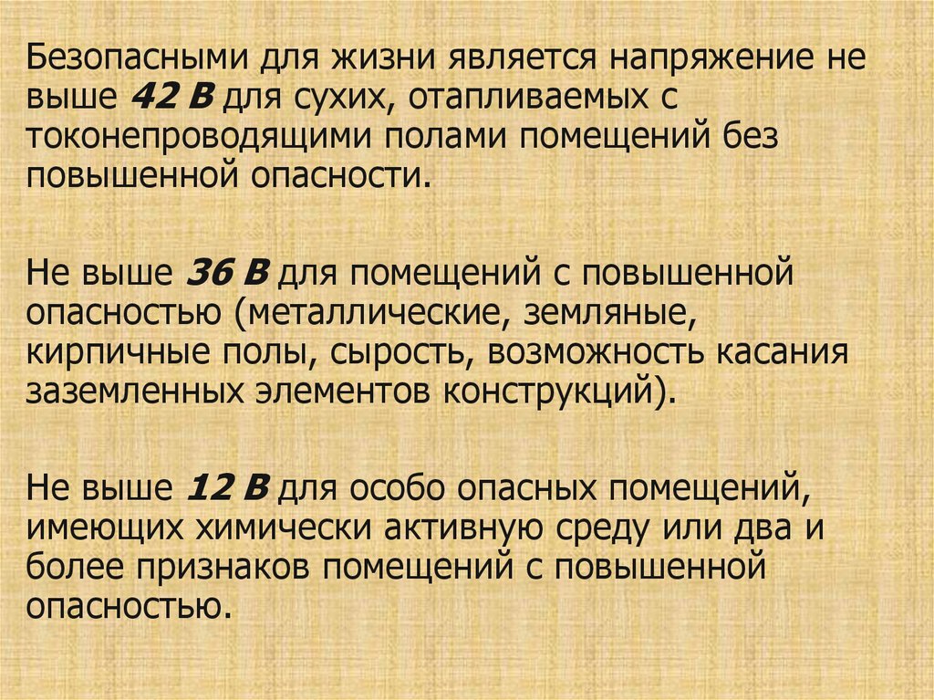 Безопасными для жизни является напряжение невыше 42 В для сухих, отапливаемых с
