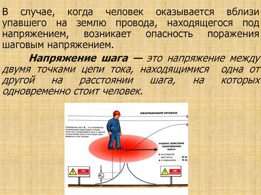 В случае, когда человек оказывается вблизиупавшего на землю провода, находящегося под
