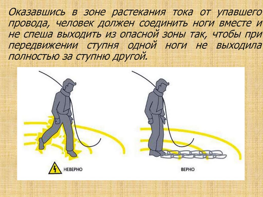 Оказавшись в зоне растекания тока от упавшегопровода, человек должен соединить ноги вместе и