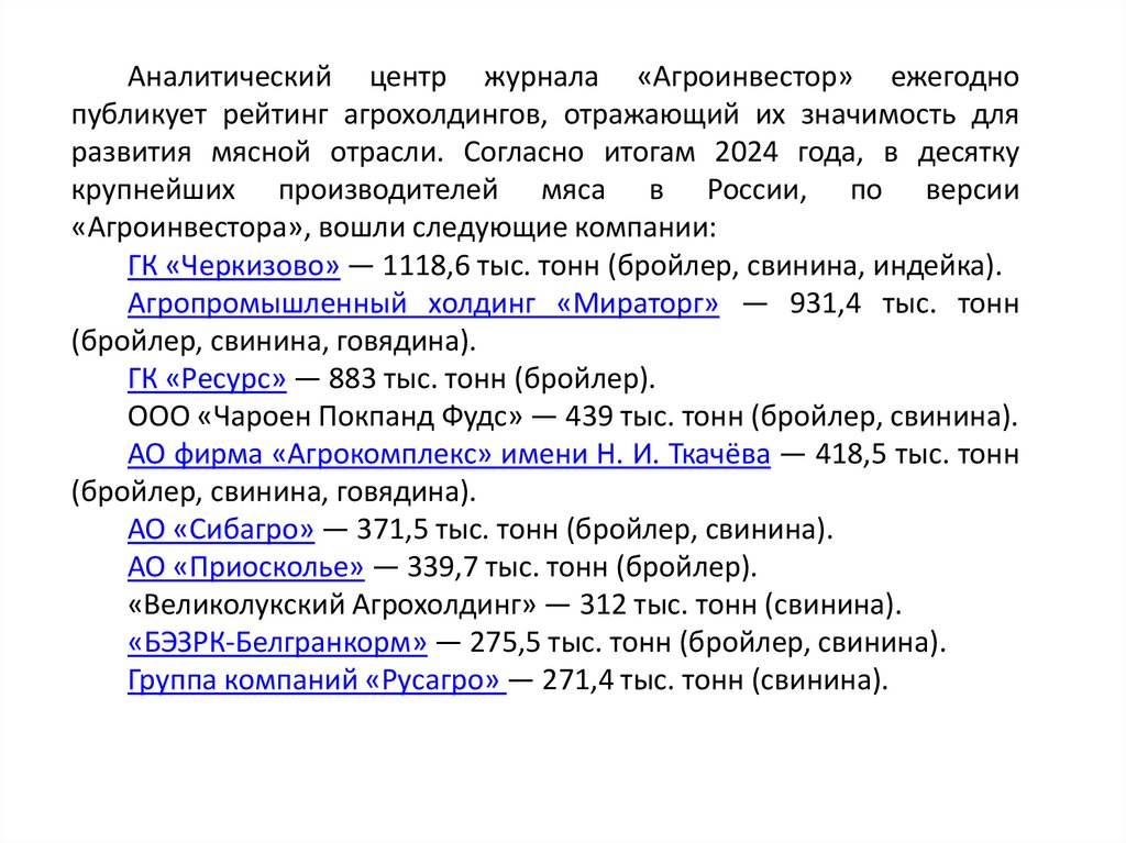 развития мясной отрасли. Согласно итогам 2024 года, в десятку