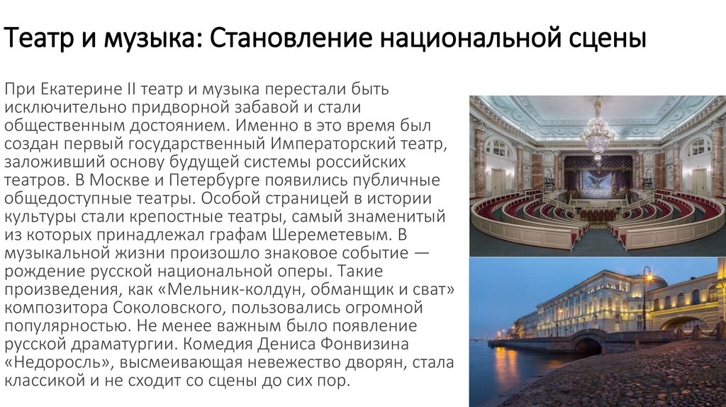 Театр и музыка: Становление национальной сценыПри Екатерине II театр и музыка перестали быть