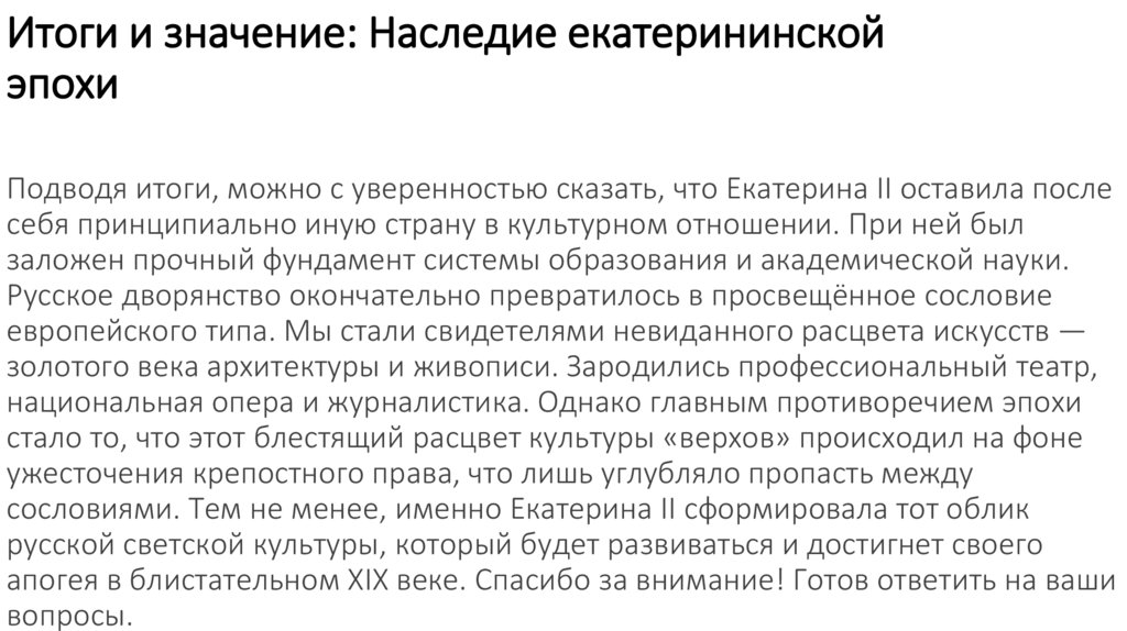 Подводя итоги, можно с уверенностью сказать, что Екатерина II оставила после