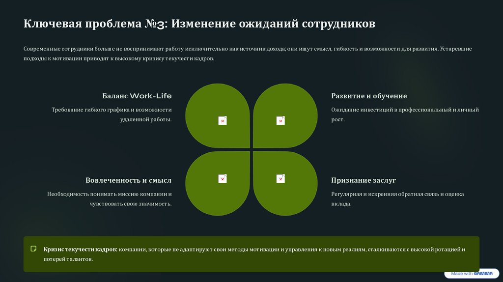 Ключевая проблема №3: Изменение ожиданий сотрудниковСовременные сотрудники больше не воспринимают работу исключительно как источник дохода; они ищут смысл, гибкость и возможности для развития. Устаревшие
