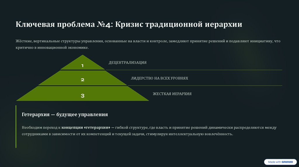 Ключевая проблема №4: Кризис традиционной иерархииЖёсткие, вертикальные структуры управления, основанные на власти и контроле, замедляют принятие решений и подавляют инициативу, что
