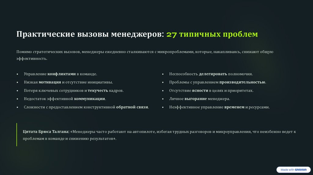 Цитата Брюса Талгана: «Менеджеры часто работают на автопилоте, избегая трудных разговоров и микроуправления, что неизбежно ведет к