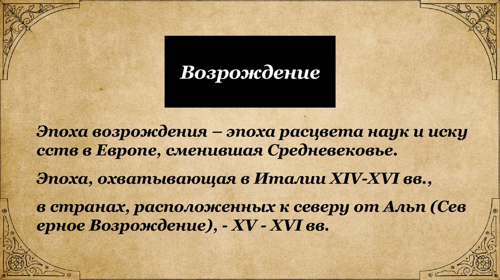 ВозрождениеЭпоха возрождения – эпоха расцвета наук и иску