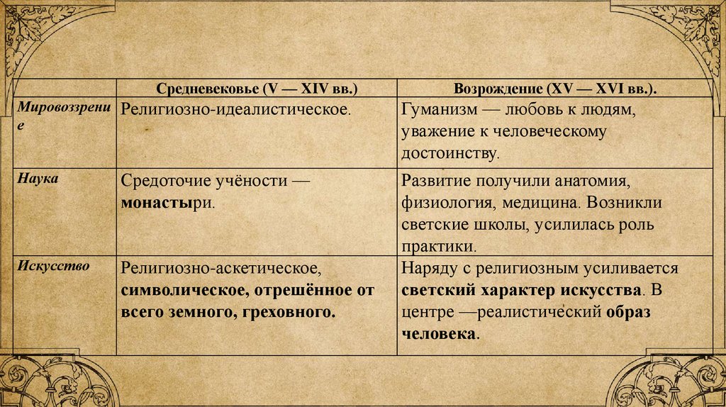 Средневековье (V — XIV вв.)Возрождение (XV — XVI вв.).
