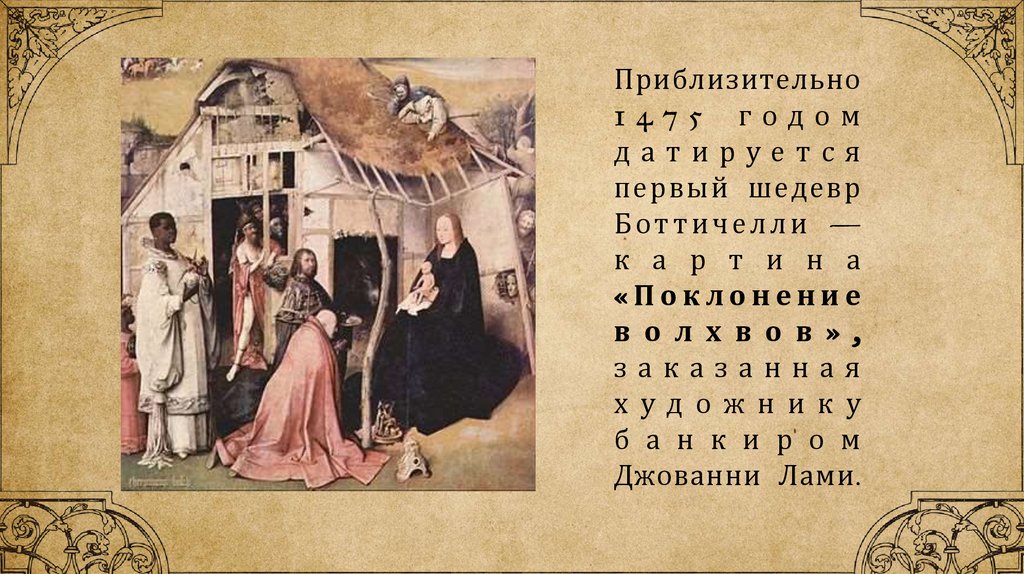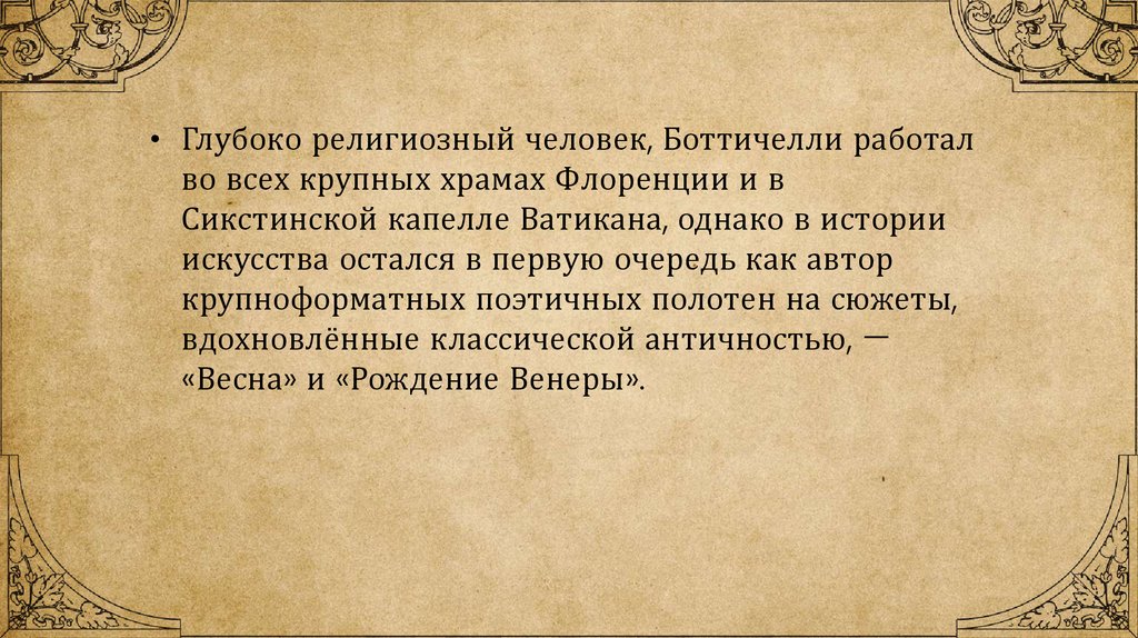 • Глубоко религиозный человек, Боттичелли работалво всех крупных храмах Флоренции и в