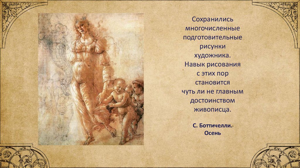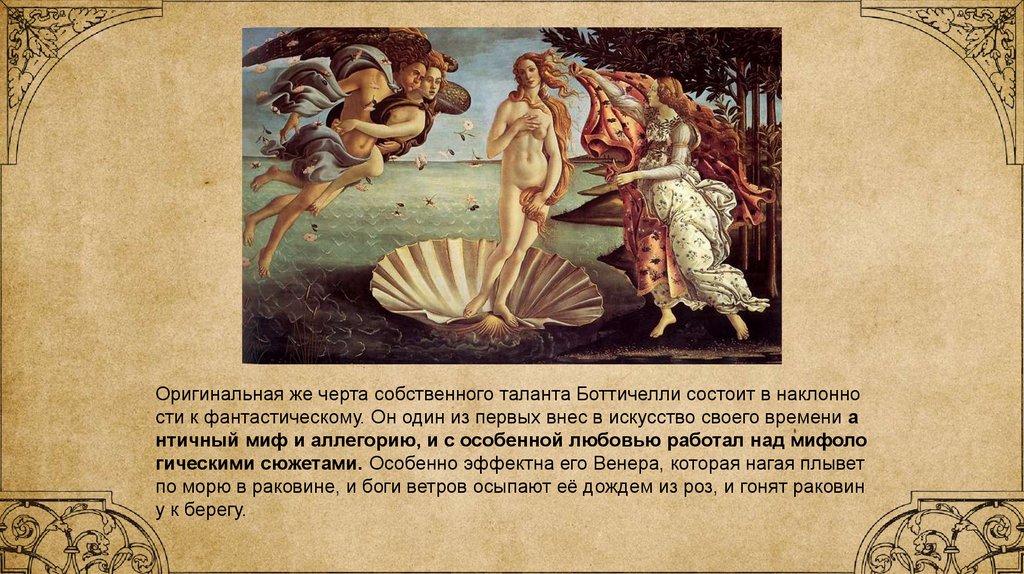 Оригинальная же черта собственного таланта Боттичелли состоит в наклонности к фантастическому. Он один из первых внес в искусство своего времени а