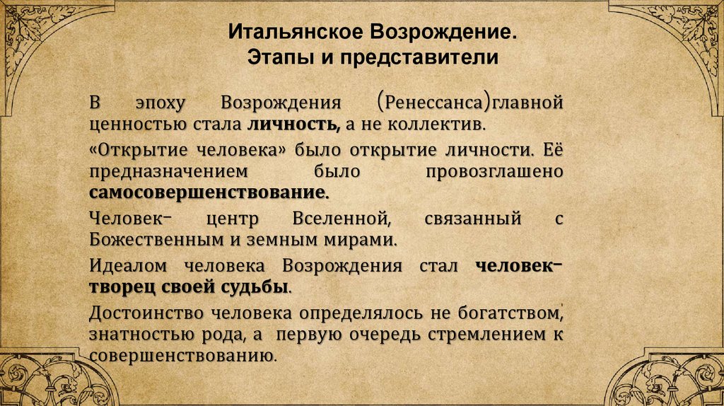 Идеалом человека Возрождения стал человектворец своей судьбы.