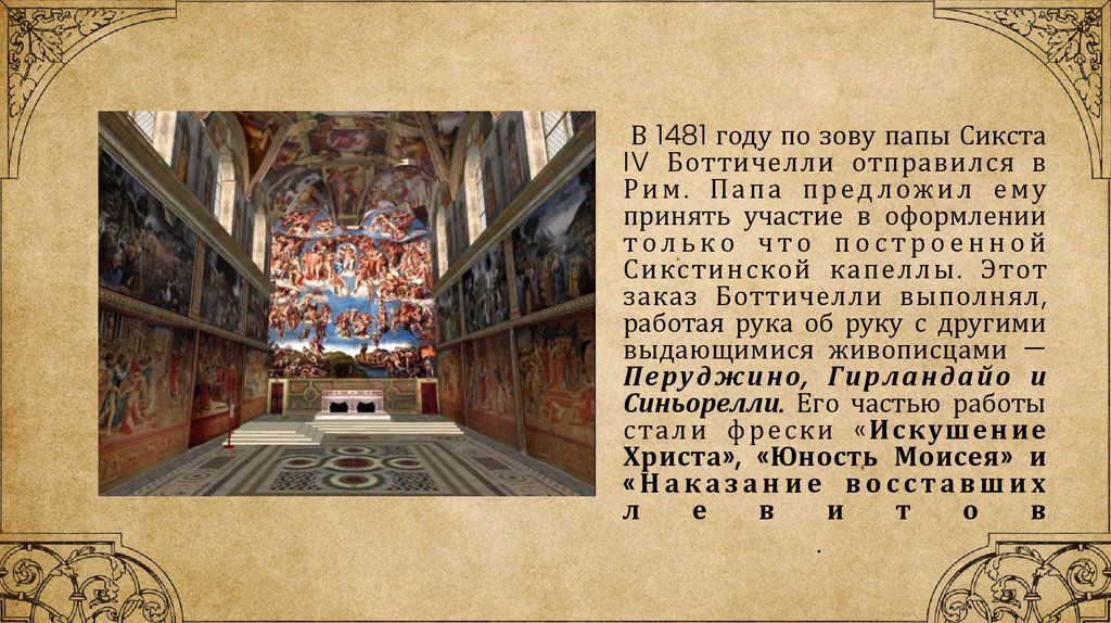 В 1481 году по зову папы СикстаIV Боттичелли отправился в