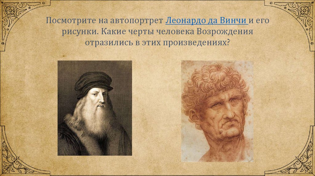 Посмотрите на автопортрет Леонардо да Винчи и егорисунки. Какие черты человека Возрождения