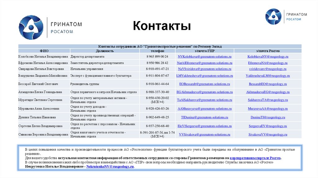 Для вашего удобства актуальная контактная информация об ответственных сотрудниках со стороны Гринатома размещена на корпоративном портале Росгео.