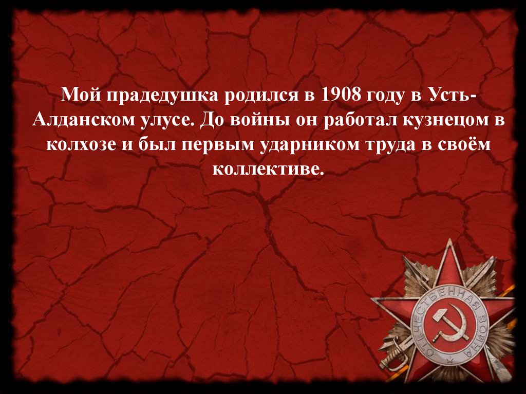 Мой прадедушка родился в 1908 году в УстьАлданском улусе. До войны он работал кузнецом вколхозе и был первым ударником труда в своём