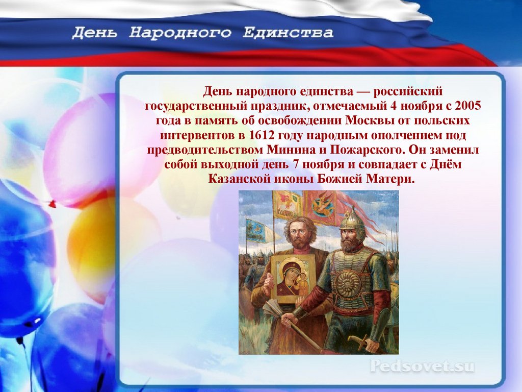 День народного единства — российскийгосударственный праздник, отмечаемый 4 ноября с 2005