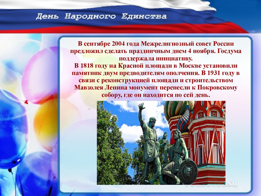 В сентябре 2004 года Межрелигиозный совет Россиипредложил сделать праздничным днем 4 ноября. Госдума