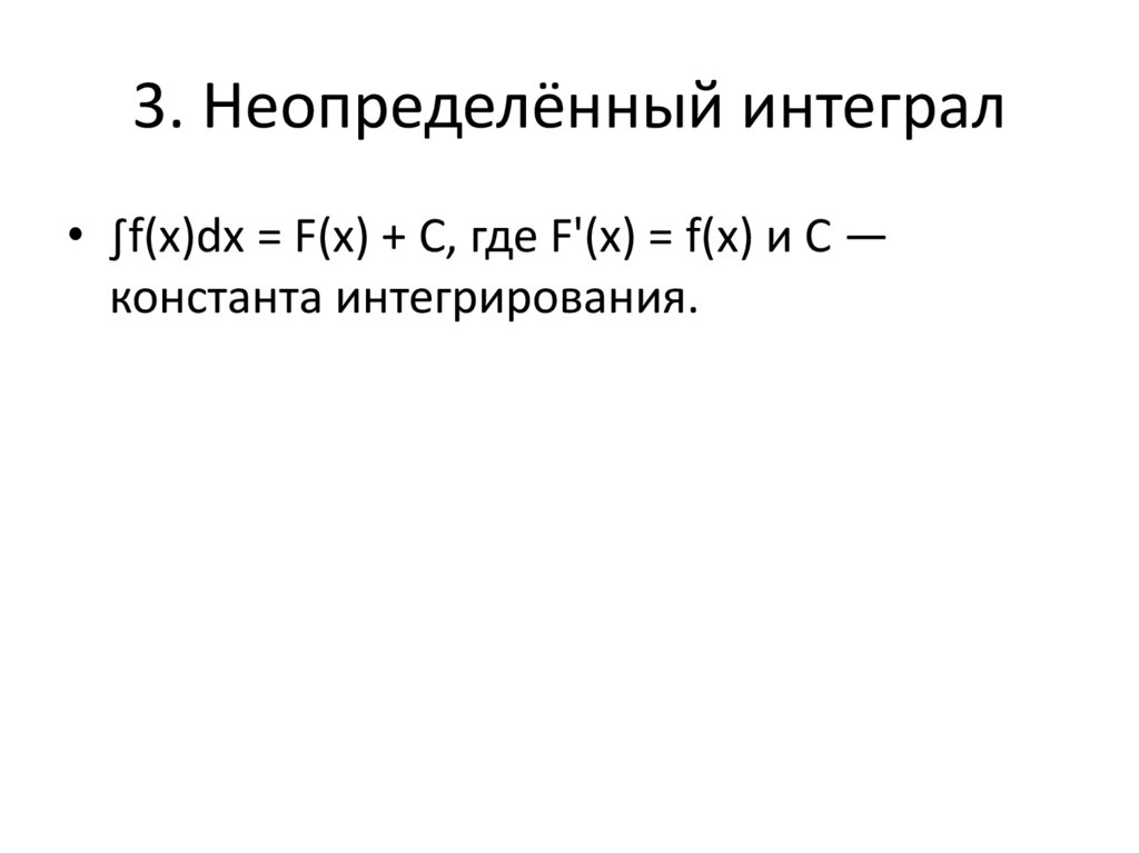 3. Неопределённый интеграл• ∫f(x)dx = F(x) + C, где F'(x) = f(x) и C —