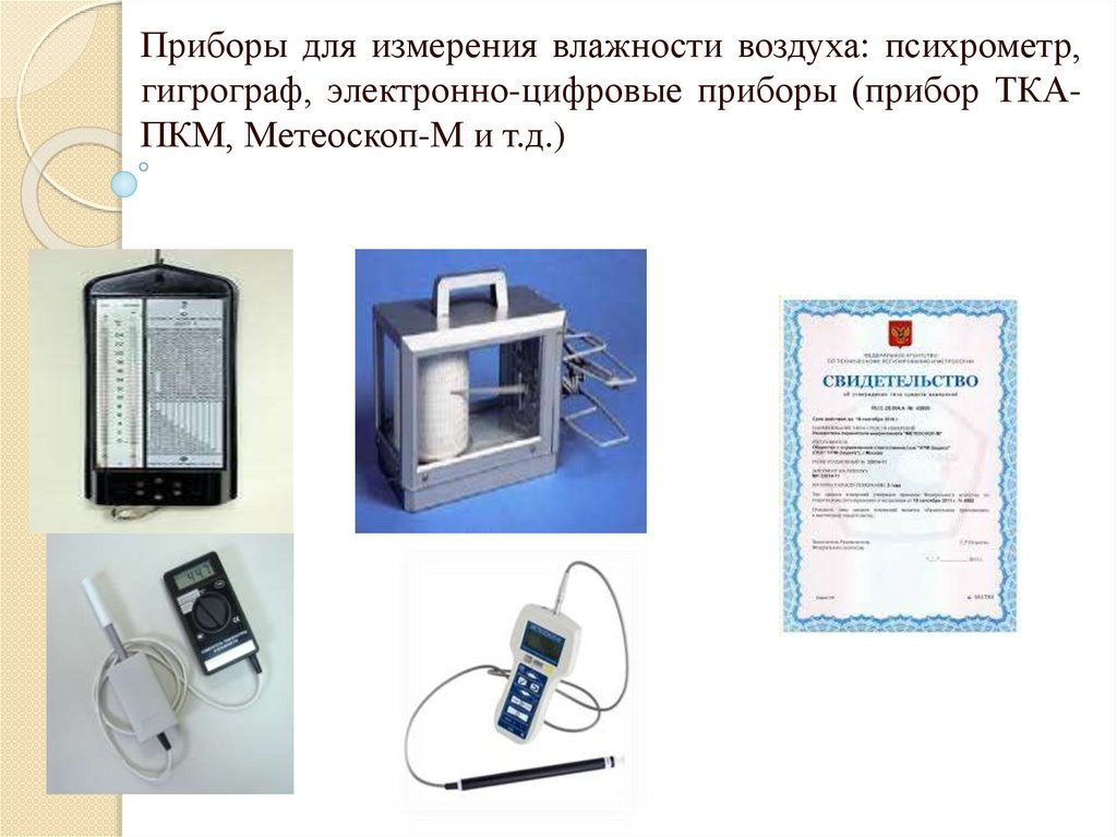 Приборы для измерения влажности воздуха: психрометр,гигрограф, электронно-цифровые приборы (прибор ТКАПКМ, Метеоскоп-М и т.д.)
