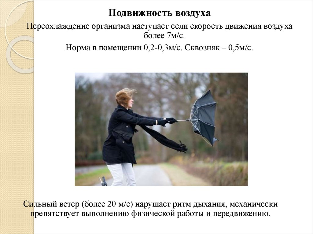 Подвижность воздухаПереохлаждение организма наступает если скорость движения воздуха