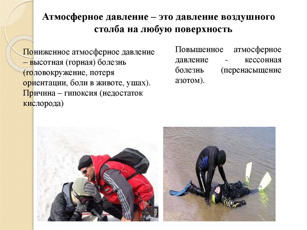 Атмосферное давление- давление воздушного столба на любуюповерхность. Норма- 760мм ртутного столба.
