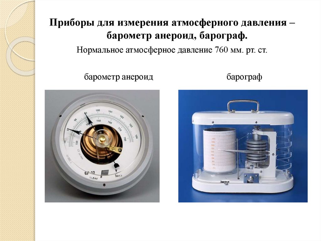 Приборы для измерения атмосферного давления –барометр анероид, барограф.