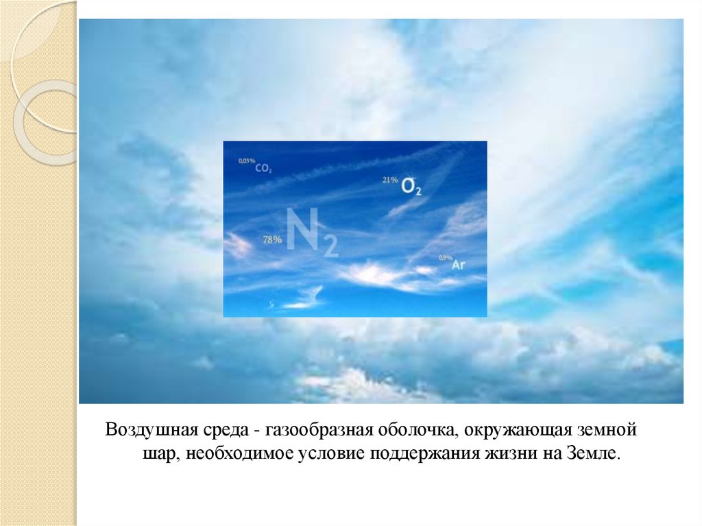Воздушная среда - газообразная оболочка, окружающая земнойшар, необходимое условие поддержания жизни на Земле.