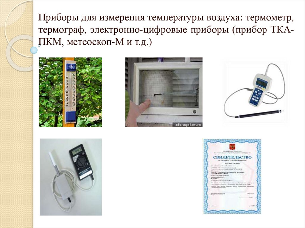 Приборы для измерения температуры воздуха: термометр,термограф, электронно-цифровые приборы (прибор ТКАПКМ, метеоскоп-М и т.д.)