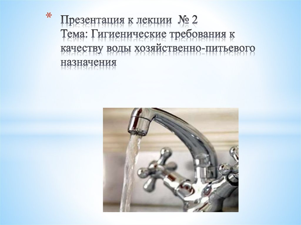 1. Презентация к лекции № 2 Тема: Гигиенические требования к качеству воды хозяйственно-питьевого назначения