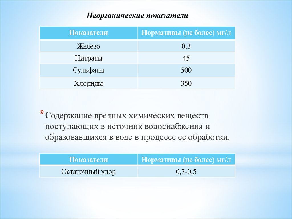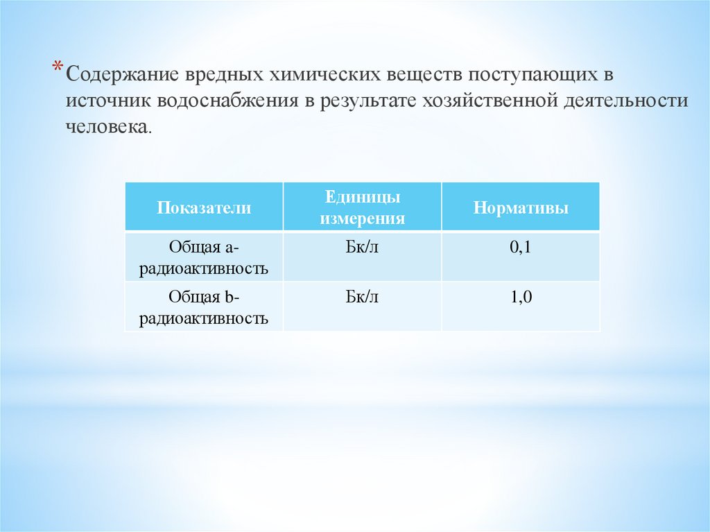 * Содержание вредных химических веществ поступающих висточник водоснабжения в результате хозяйственной деятельности