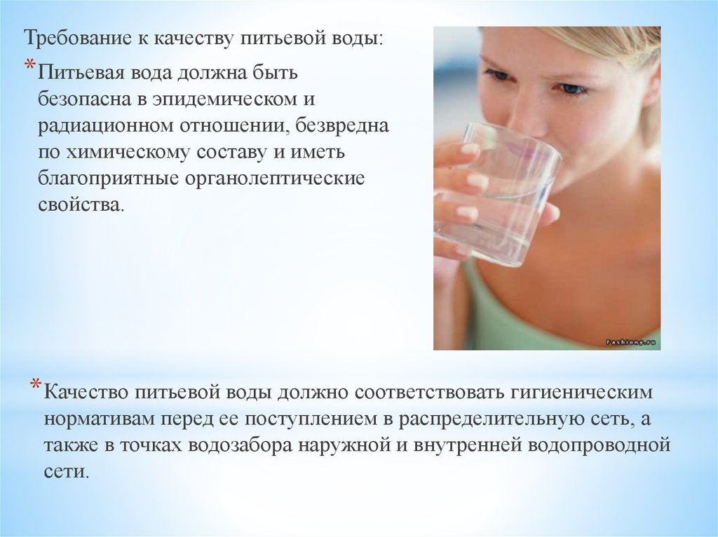 Требование к качеству питьевой воды:* Питьевая вода должна быть