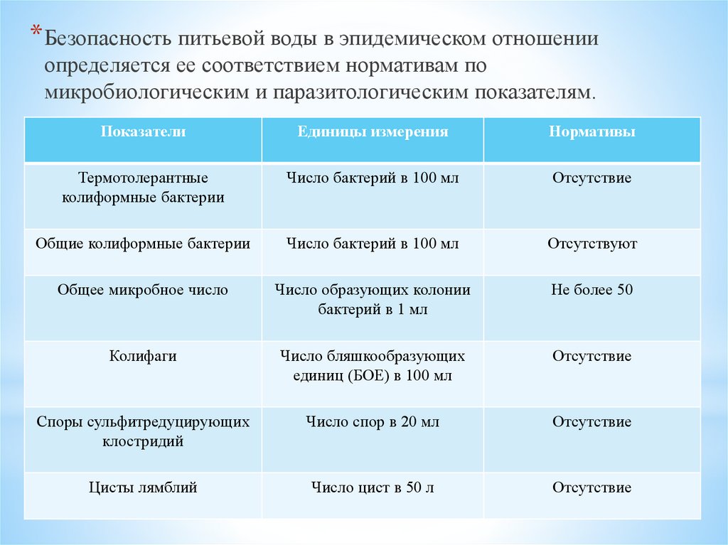 * Безопасность питьевой воды в эпидемическом отношенииопределяется ее соответствием нормативам по