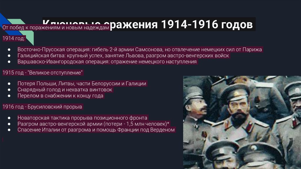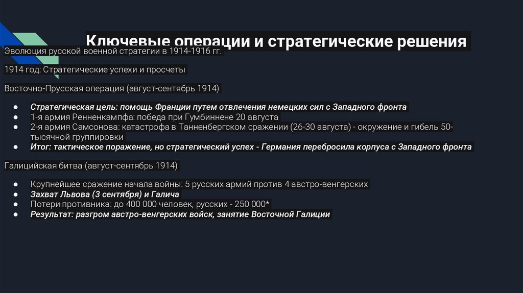 Ключевые операции и стратегические решенияЭволюция русской военной стратегии в 1914-1916 гг.