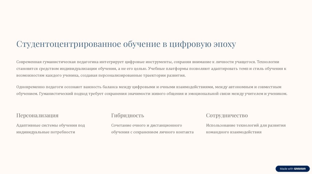 Студентоцентрированное обучение в цифровую эпохуСовременная гуманистическая педагогика интегрирует цифровые инструменты, сохраняя внимание к личности учащегося. Технологии